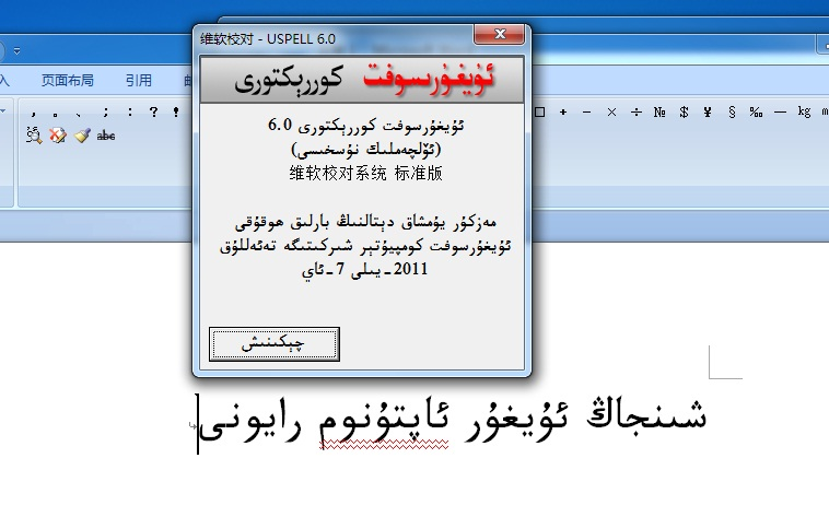 在Microsoft Word2003/2007中嵌入了维吾尔文拼写检查功能,及时发现常见的拼写错误。拼写检查速度为3000-5000词/分钟。
