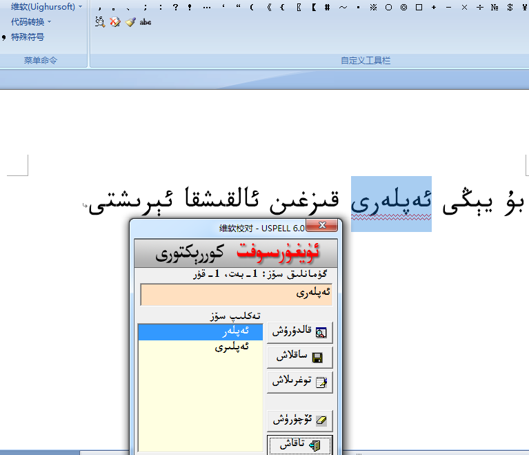 校对过程中,将怀疑的错处用醒目的颜色或下划线在屏幕上标出来,以示警告,并提供修改建议。多数情况下用户不必输维吾尔词,仅选择系统提供的修改建议候选词便可完成修改。
