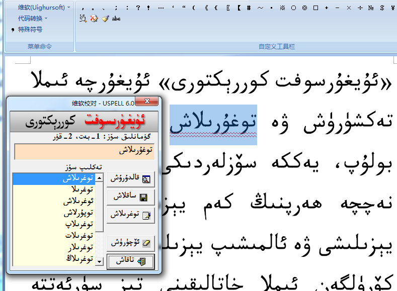 在Microsoft Word2003/2007中嵌入了维吾尔文拼写检查功能,及时发现常见的拼写错误。拼写检查速度为3000-5000词/分钟。